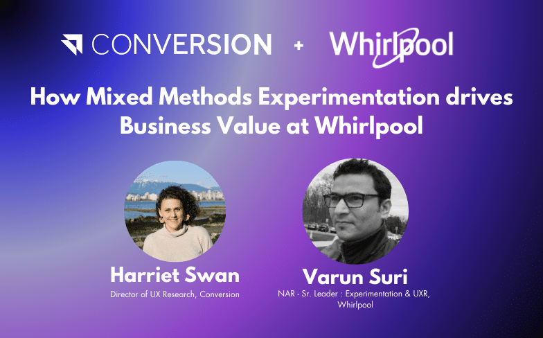 In this session, we sit down with Whirlpool’s Site Experience & Experimentation & UX Strategy Lead, Varun Suri.  Our Director of UX Research, Harriet Swan, has an in-depth conversation with Varun about the benefits of using Mixed Methods experimentation, how this method has driven value and advice on evolving your own Mixed Methods experimentation program.