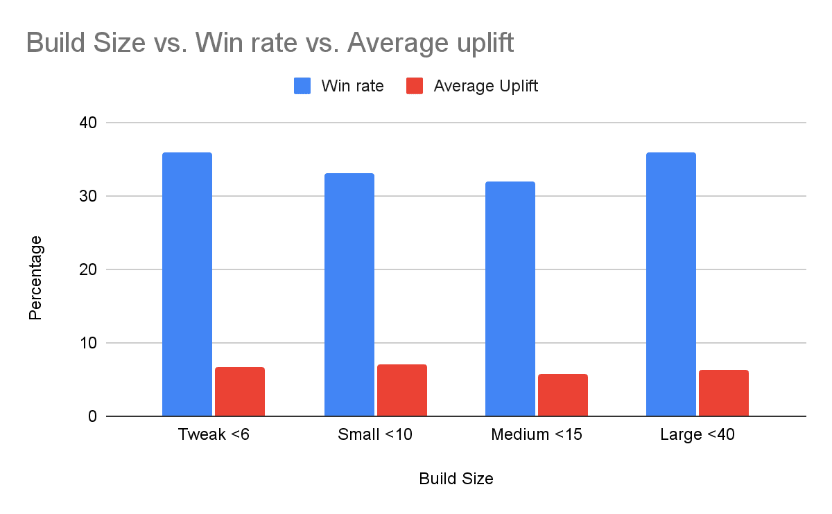 A while ago, we dug into our database of experiments to look at the average uplift for experiments of different sizes. What we found was that large experiments were no more likely to win than minor tweaks – and that they actually had a slightly smaller uplift than tweaks as well (see chart below)!
