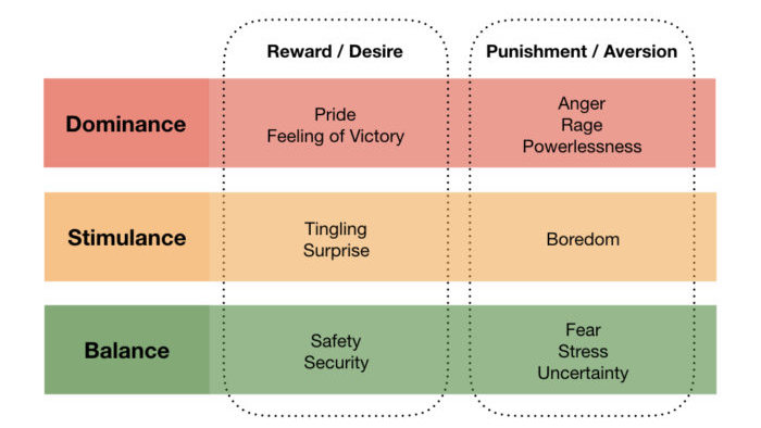 • The Dominance System, which focuses on performance, self-assertion, the suppression of competition, and achieving status, power, and autonomy. This system’s desire is pride or a feeling of victory. And its aversion is anger, rage and powerlessness.