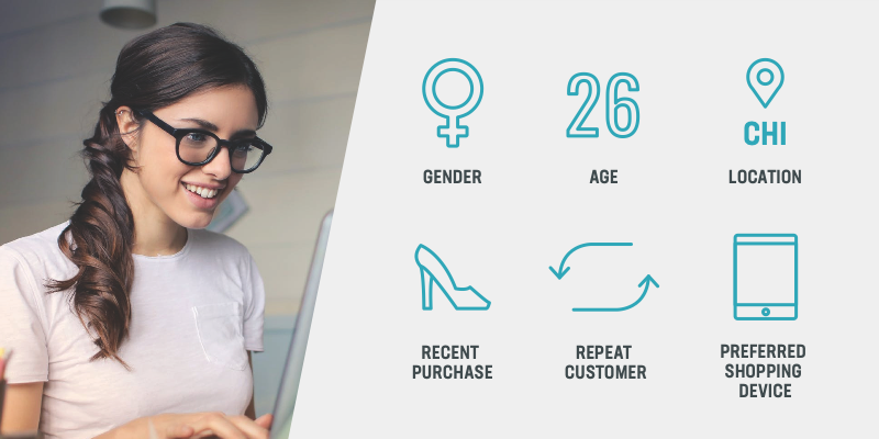 Suppose you’re a marketer at Madewell, for example. You might know that your customer, Gwen, is a woman in her mid-20’s, living in Chicago. Her recent purchase history might include buying heels in size 7. You might also know that she is a repeat customer and most often purchases from her tablet.