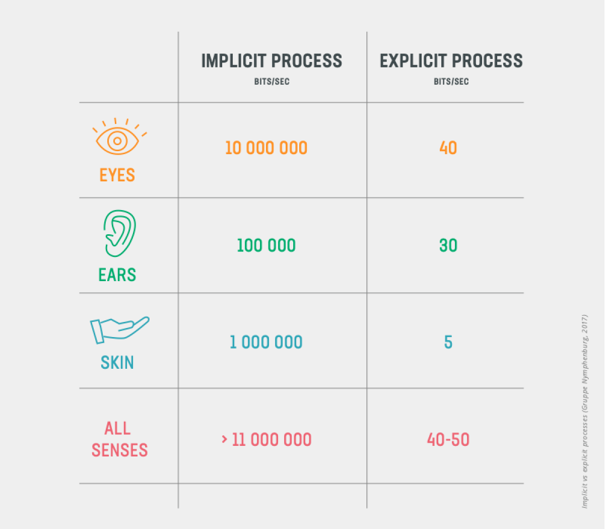 Implicit vs. explicit processing illustrated in bits of information absorbed per second.