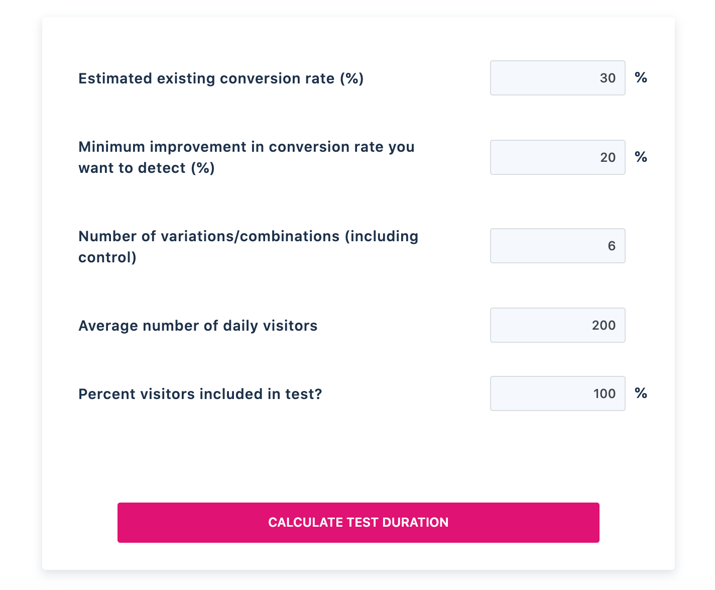 A test duration calculator like this one from VWO can help you determine how long to run an A/B test for.