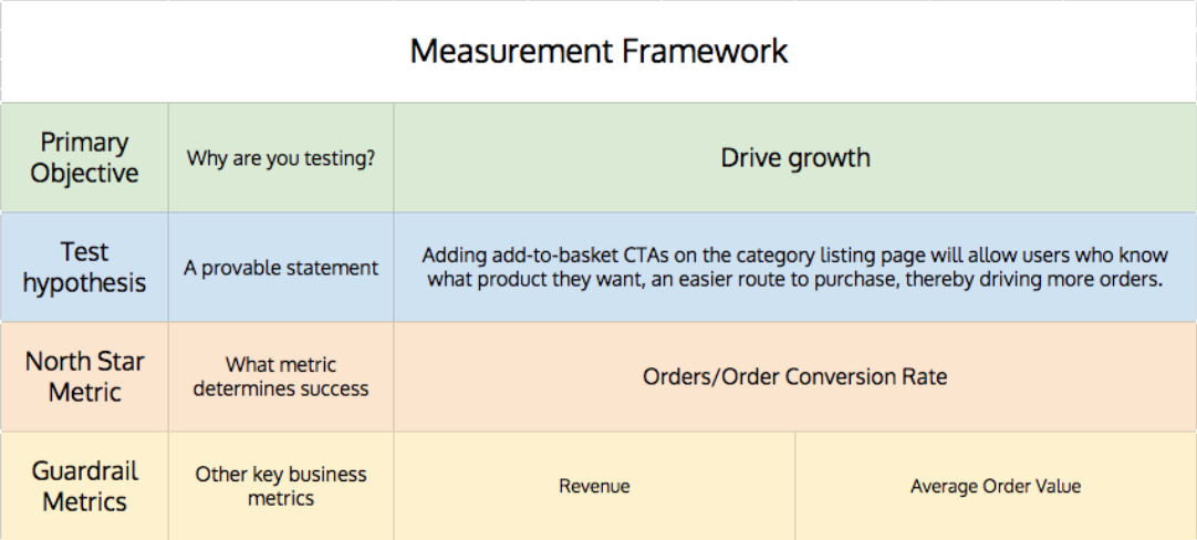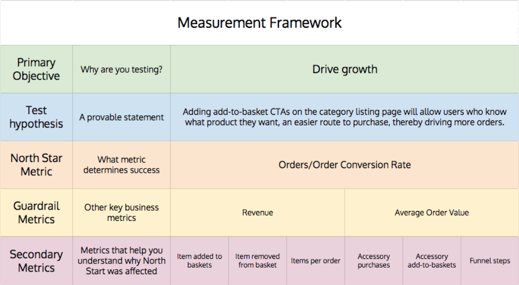 You should also be defining ‘guardrail metrics’. These tend to be second tier metrics that relate to key business metrics, which if they perform negatively could call into question the interpretation of how successful the test is. If the test loses but these perform well, it’s also probably a good sign you’re on the right track. They don’t, on their own, define the success or failure like the North Star metric, but they contextualise the North Star metric when reporting on the test.