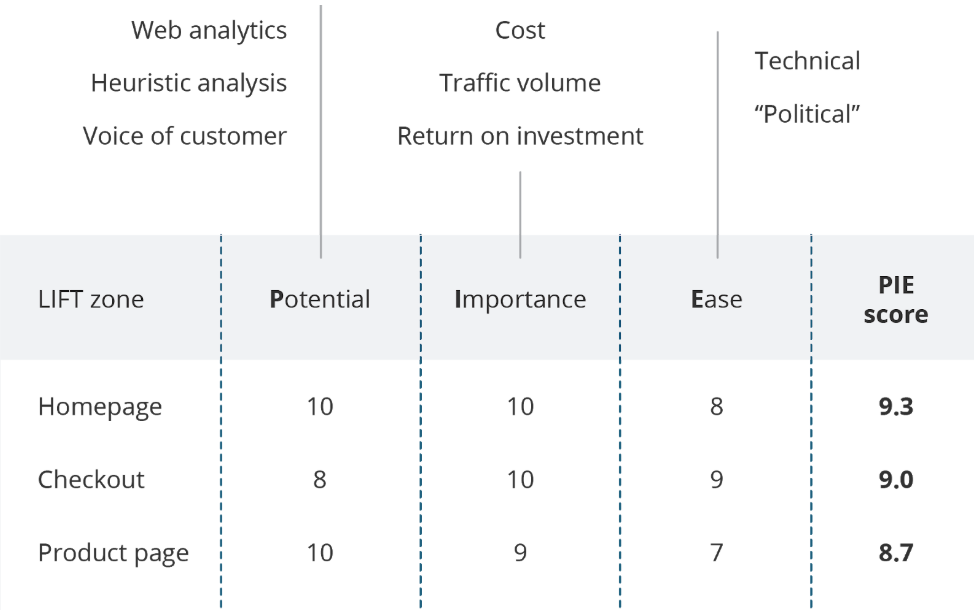 We think PIE is simple and easy to use, analyzing only 3 factors. However, some concerns with this model are  that the scoring can be very subjective and there can be an overlap between Potential and Importance.