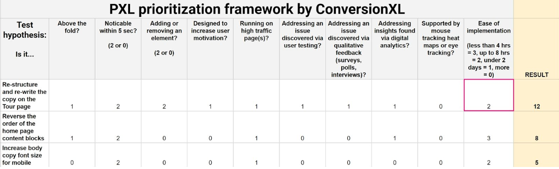 The PXL is a lot more complex than the previous two, giving eight to data and insight which we think is very important. In addition, the PXL model goes a way towards eliminating subjectivity by limiting scoring to either 1 or 0 in most columns. One limitation of this model is that it doesn’t account for differences in page value rather than just page traffic, nor does it give you a way to factor in learnings from past experiments. It also has the potential to be very time consuming and you may not easily be able to complete all columns for every experiment.