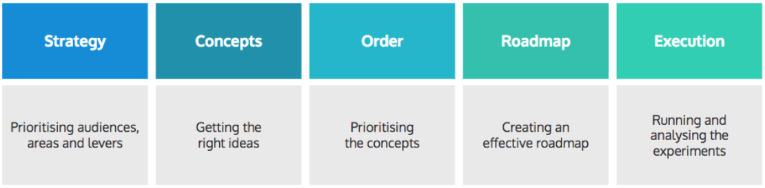 The biggest difference with our approach is that prioritization happens at two separate stages. We want to avoid a situation where we are trying to prioritize a large number of experiments with different hypotheses, KPIs, target audiences and target pages against each other. In our approach individual experiments are prioritized at the ‘Order’ stage however, we minimise the need for directly prioritizing experiments against each other by first prioritizing at the strategy stage.