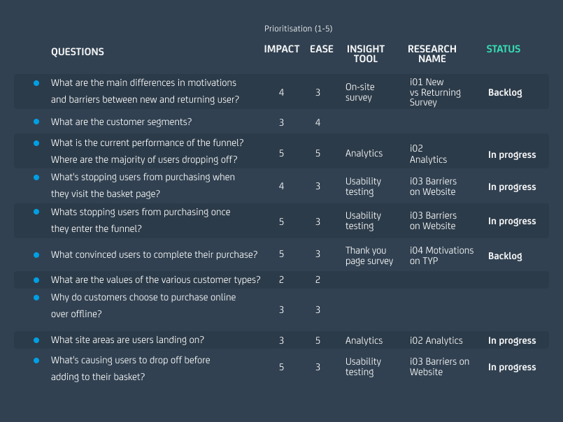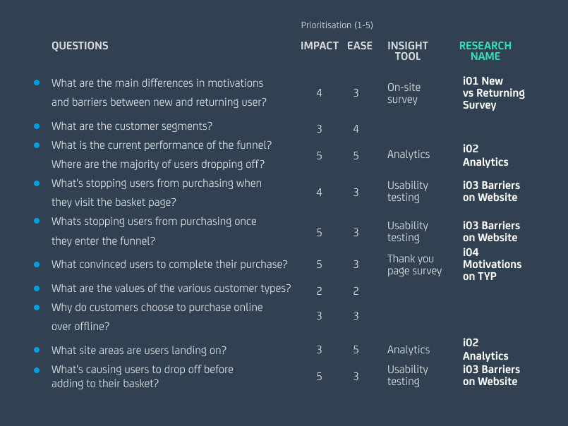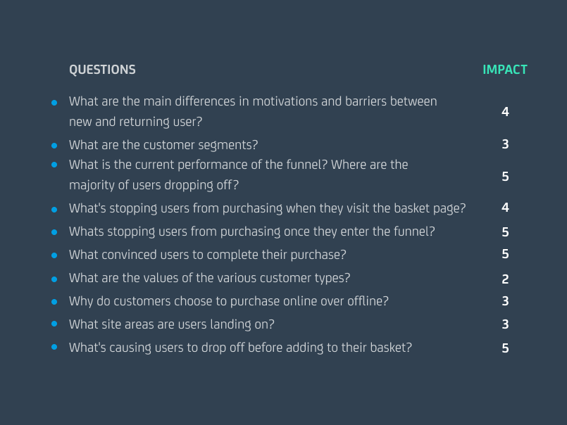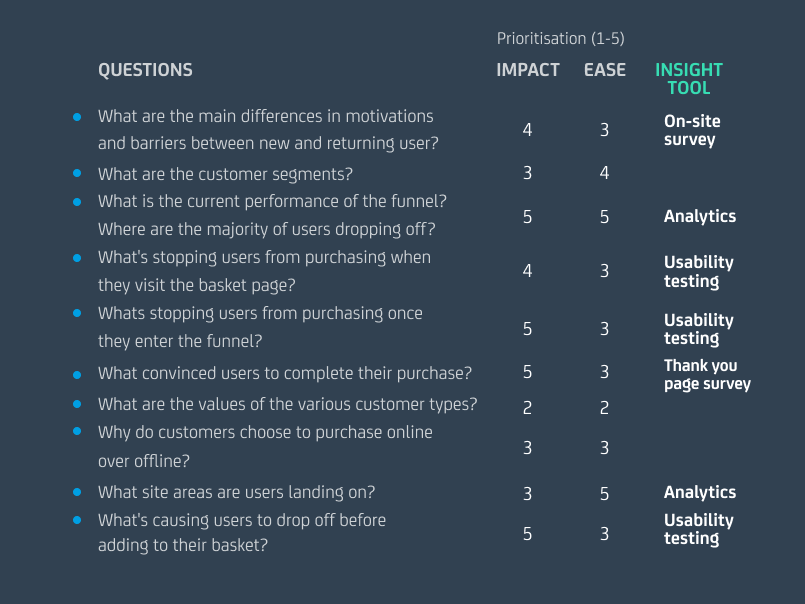 When conducting research to generate insight, we use what we call a question-led approach. Any piece of research we conduct must have the goal of answering a specific question. We identify the questions we need to answer about a client’s business and their website and then conduct only the research we need to answer them. Taking this approach allows us to be efficient, gaining impactful and actionable insights that can drive our experimentation program.