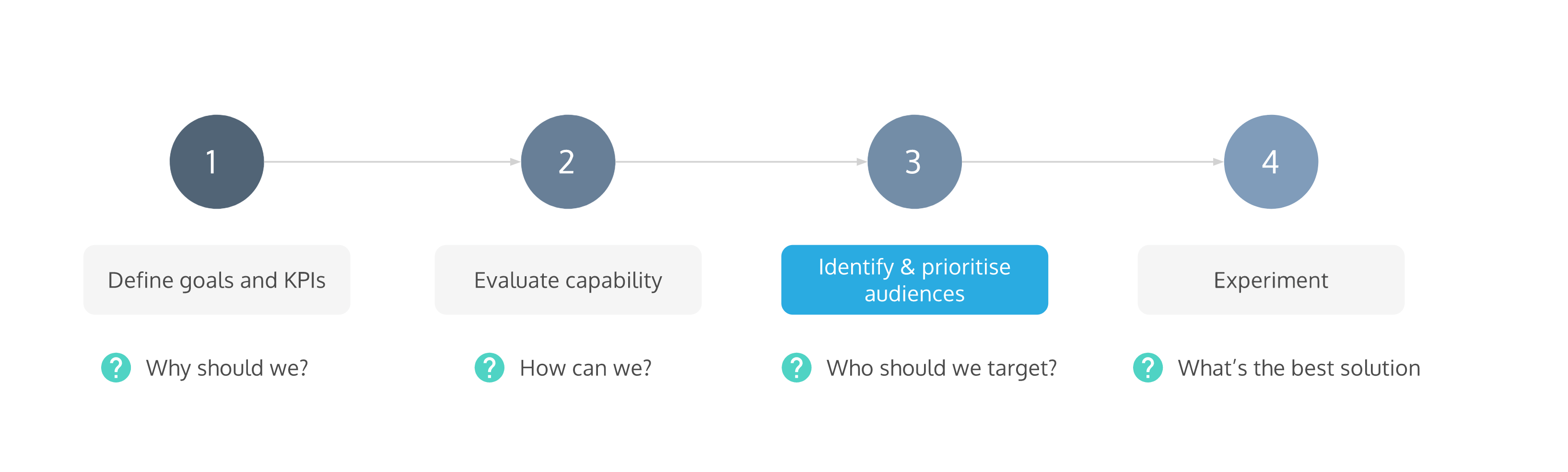 You might wonder why this isn’t the first step of the framework? The reason is, evaluating capability can be a big, time-consuming task. If you don’t have a clear objective in mind to evaluate your capabilities against, you could end up spending a lot of time looking for capabilities that aren’t actually needed. Defining the goals and KPIs keeps us focused on answering whether we have the right data required to target specific users and if so, is this data accessible on the site for us to use in testing?