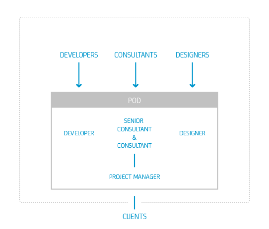 A pod is like a small startup inside the company. Instead of organizing your business in separate functional departments, you create teams that contain a member of each function. Let’s illustrate what we have done within our company: