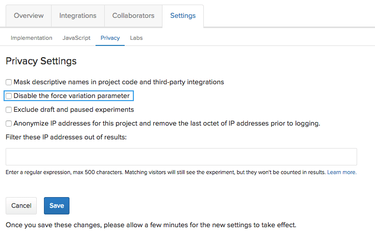 Firstly, you will need to make sure your Optimizely project allows you to use the force variation parameters. To check this, simply go to Settings->Privacy within the dashboard and make sure “Disable the force variation parameter” is unchecked. If it is checked, just uncheck it and hit “Save”.