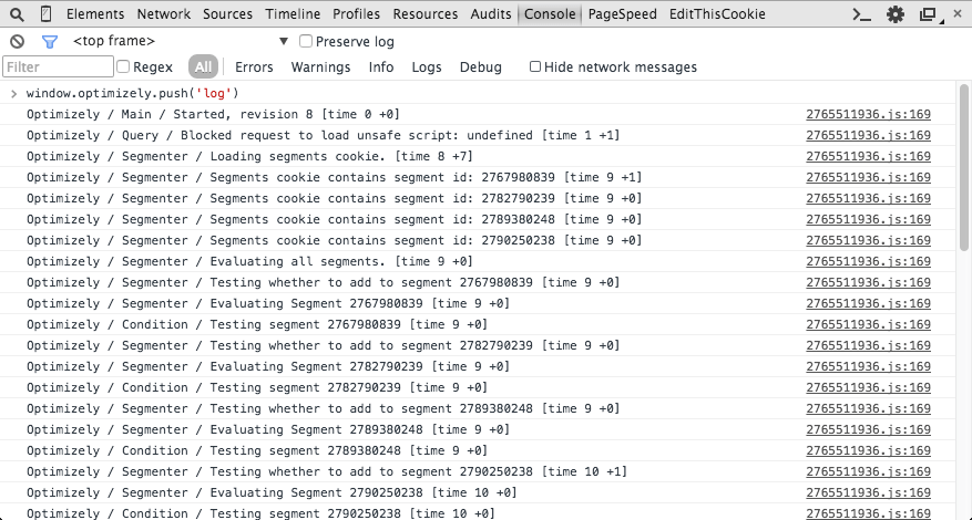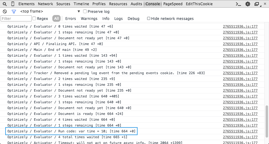 My first essential tip is the use of the invaluable Optimizely log. The log contains all the information on bucketing, segmentation, audiences and code execution on your site on page load while also displaying execution times of each part in the process (for further documentation on the log, see this Optimizely knowledge base article).