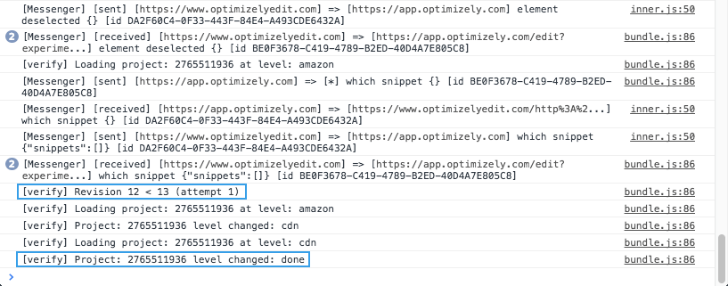 The first line that is highlighted displays the previous revision (“12”) along with the new revision (“13”) and the number of times it has been attempted (in this case it only attempted it once but this has been known to go over 100 if the Optimizely platform is under large load). The second line shows that it has completed updating the CDN to correct revision. Edit: As noted by Toby Urff from Optimizely, the editor also shows when the snippet is up-to-date by showing “(Uploading to CDN)” next to the “Save” button while it saves and then is hidden once the revision number of the snippet matches the revision number of that save.