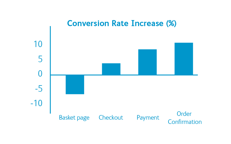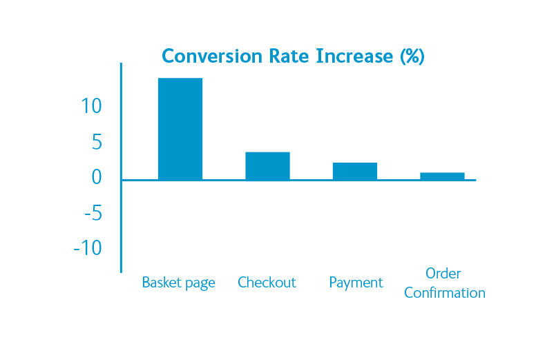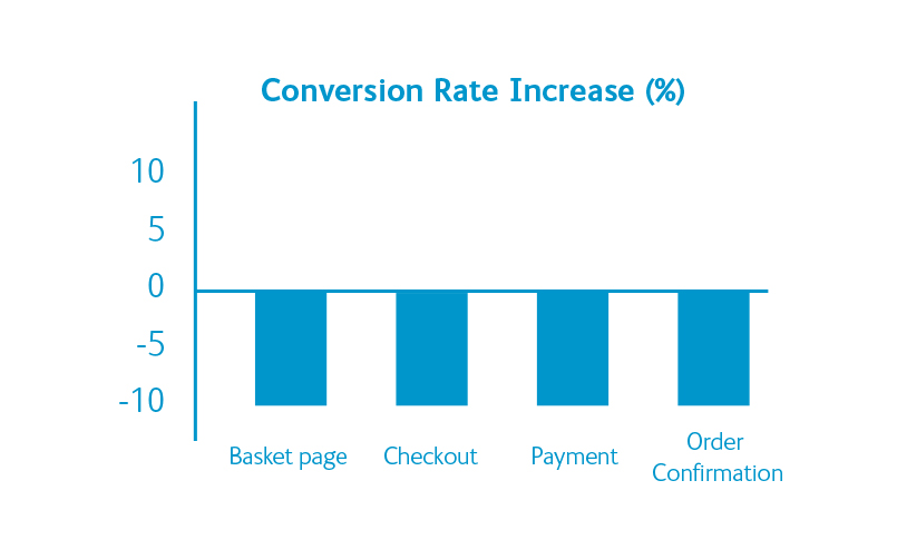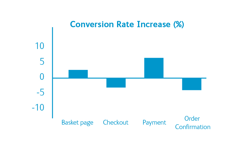To see the pattern in our results in each case, we’ll plot a simple graph of the conversion rate increase/decrease to each page. We’ll then look at how this increase/decrease in conversion rate has changed as we move through our site’s checkout funnel.