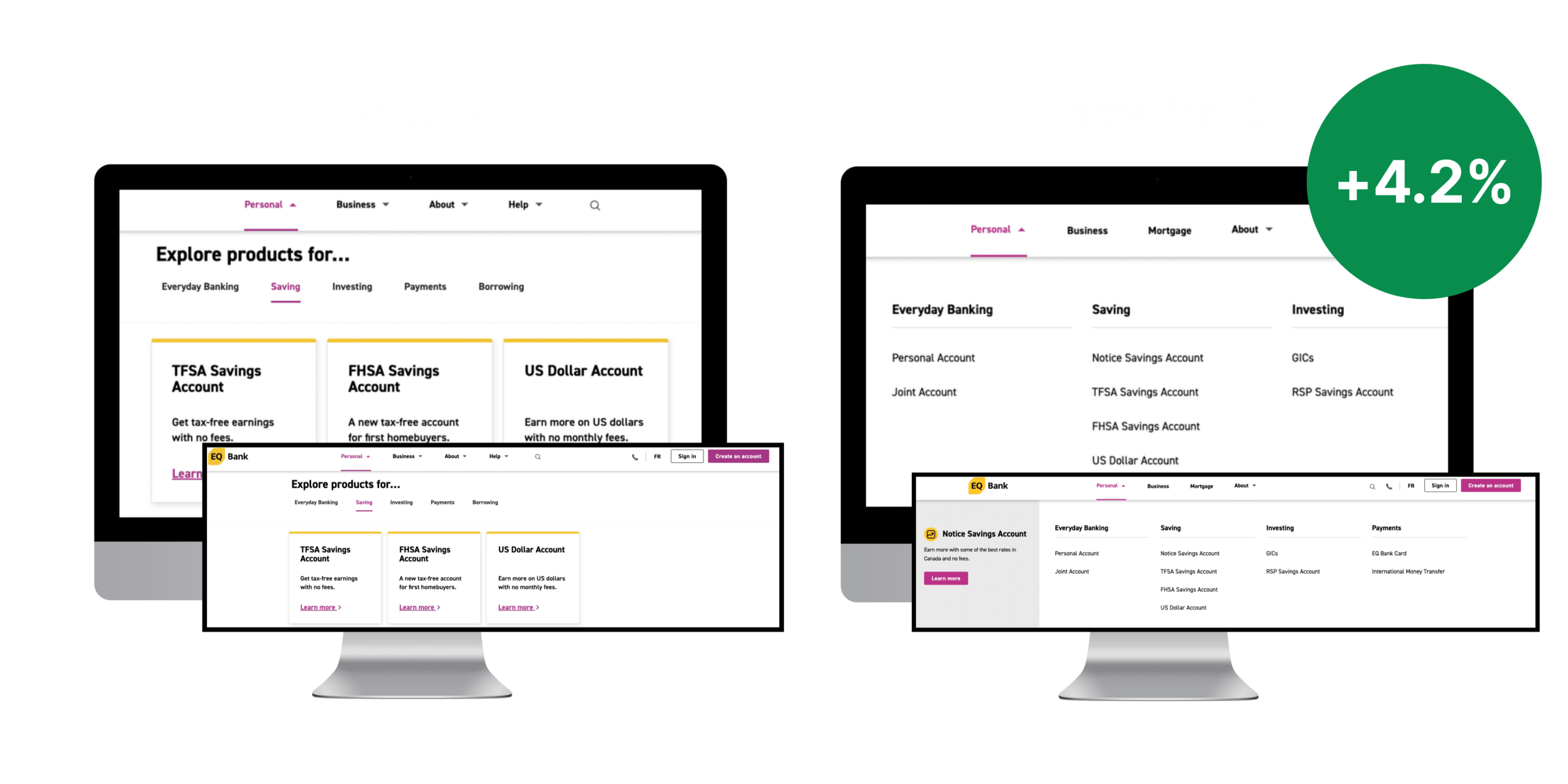 For example, in one test we ran on the Comprehension Lever (more on Levers shortly), we sought to improve visibility and awareness of EQ Bank’s Personal banking products. To do this, we adopted an industry best practice that involved auto-exposing ‘Personal’ navigational elements, but this test produced an inconclusive result.