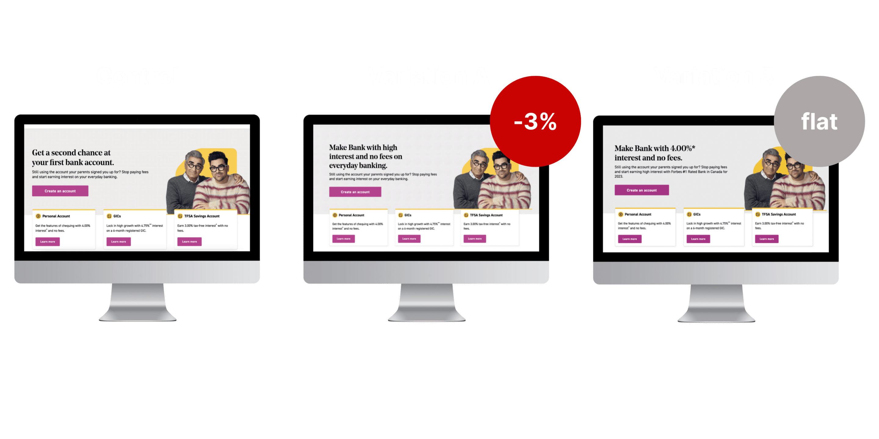 Similarly, in another test, this time on the Motivation Lever, we tested different value propositions and messaging to determine the most effective ways to communicate Equitable Bank’s offering. After seven days, neither variation proved successful, and application starts and email verifications decreased.