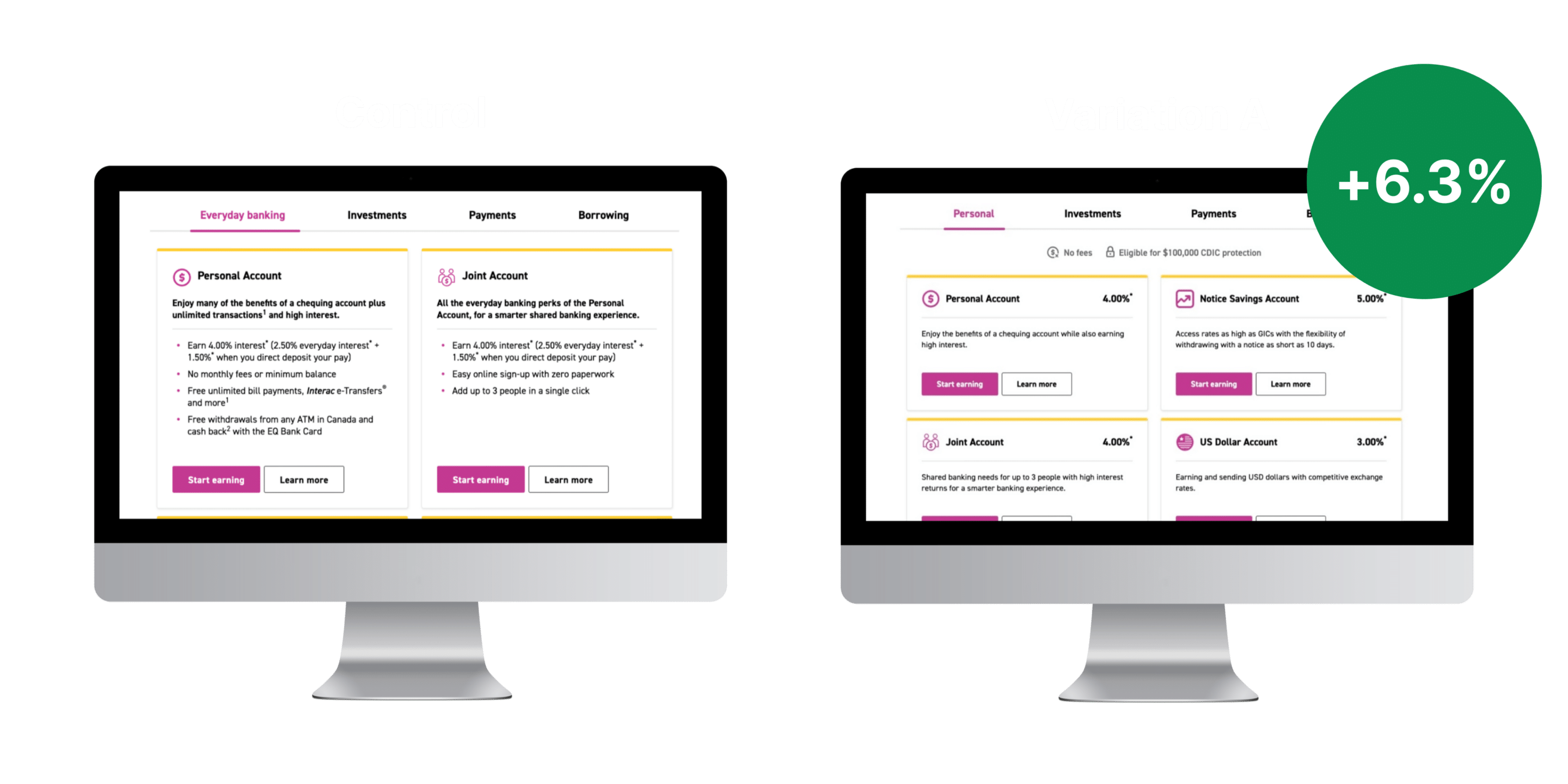 Like many websites, EQ Bank’s homepage included a carousel that rotated through a number of its most popular products. Our initial research suggested this was a worst-of-both-worlds approach, neither highlighting the bank’s value proposition nor showcasing its products.