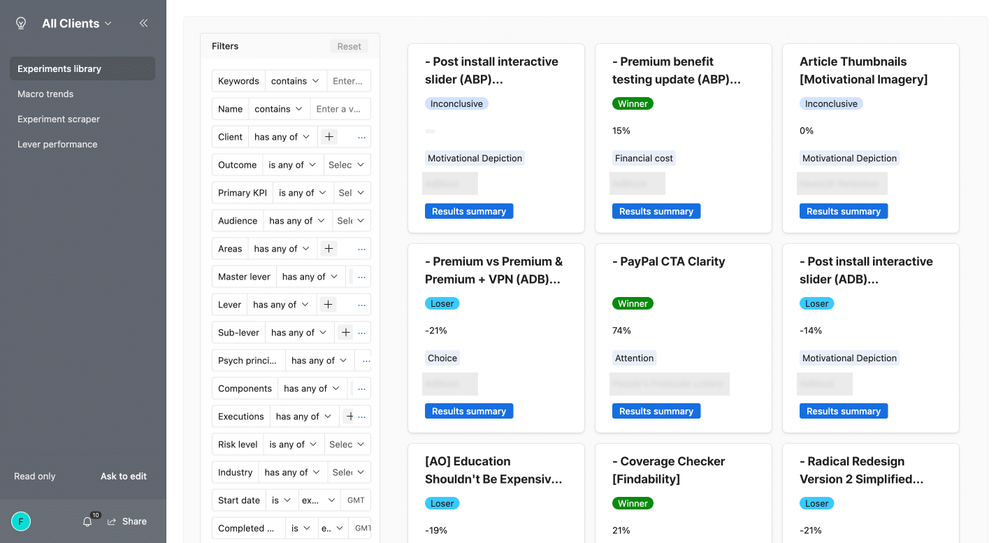 Our repository allows us to gain a bird’s-eye view on what’s working with our methodology and what’s not. Over time, we’ve been able to use this data to question our assumptions, invalidate company lore, and refine how we approach experimentation.