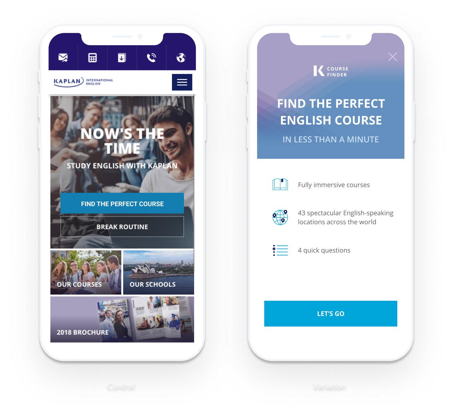 In the control, visitors to Kaplan could browse pages of content about English-learning courses. With over 40 to choose from, it was hard for visitors to differentiate between courses. While most visitors would abandon their search, some would contact an advisor, who would then have to support the prospect in choosing a course.
