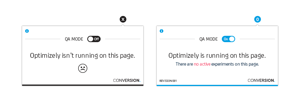 • Quickly see whether Optimizely is running on the page (if the circle turns blue, Optimizely has been detected on the page)