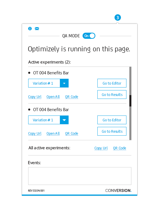 • Finally, make sure you are tracking the right events with the events console. This will show you Optimizely tracking, segmentation info and manual activation info.
