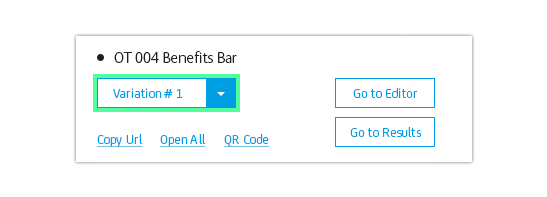 • Switch variations quickly within an experiment with the handy drop-down selector. This will reload the page and bucket you into whichever variation you have selected.
