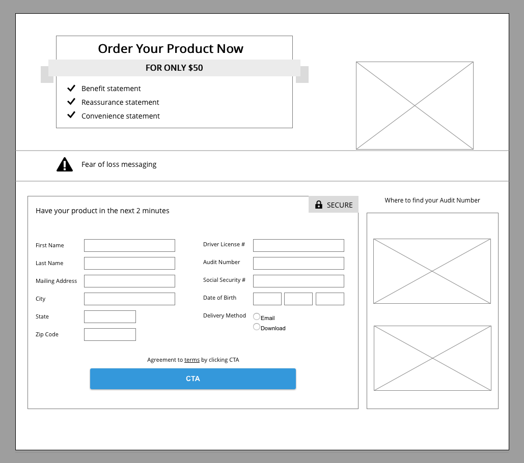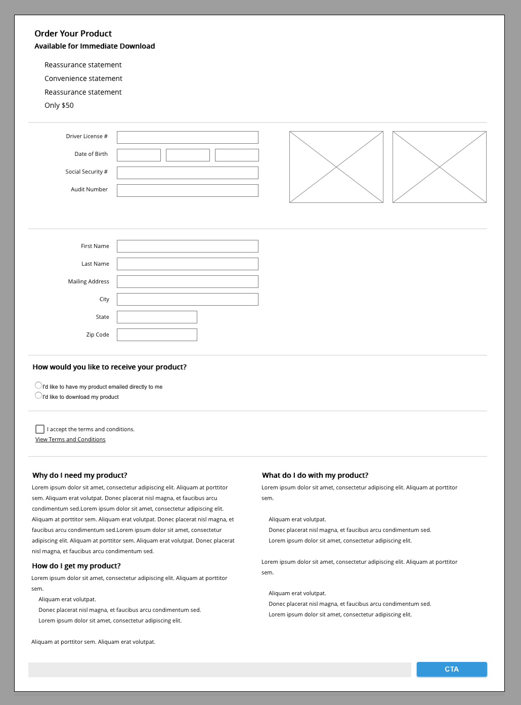 Wireframe to demonstrate the original page layout for the driver record upsell