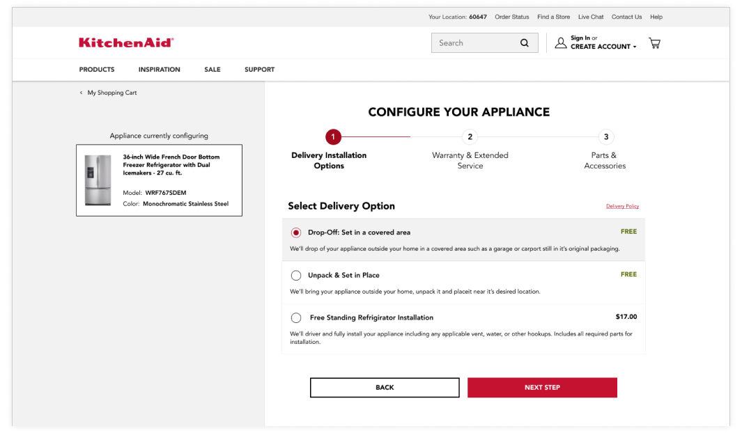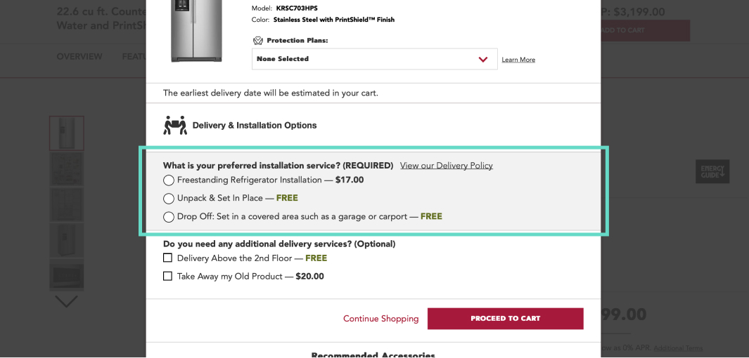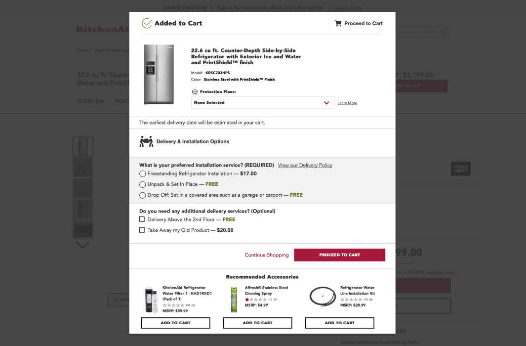 A key area of focus for Whirlpool has been on optimizing the interstitial experience, a modal which is shown to prompt users to select additional services and options. This Interstitial was shown to users when they select an appliance before they proceed to their cart, and was shown again after the cart as they move to checkout, if they hadn’t selected delivery options initially.