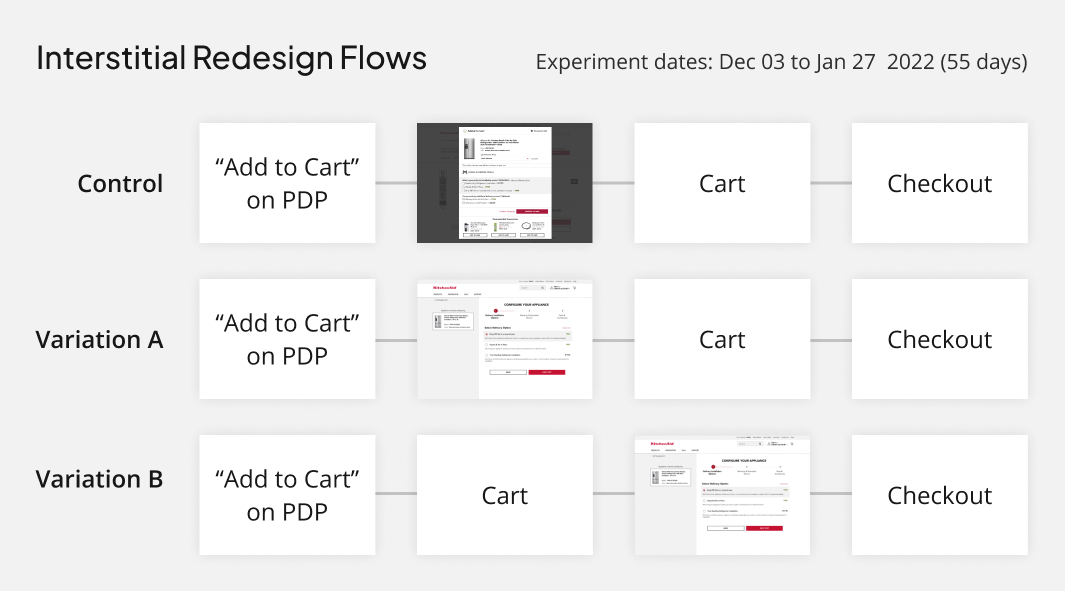 An A/B test found that most users are ignoring or bypassing the interstitial experience. It also found that revenue per visitor (RPV) can be increased if users go straight to the cart when selecting an appliance and only see the interstitial once, when they are moving from cart to checkout.