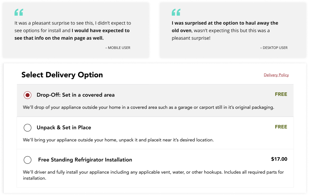 One highlight from the study included users being positively surprised by the delivery options and pricing communicated in the interstitial, and even suggested this information to be more prominently displayed earlier in the journey: