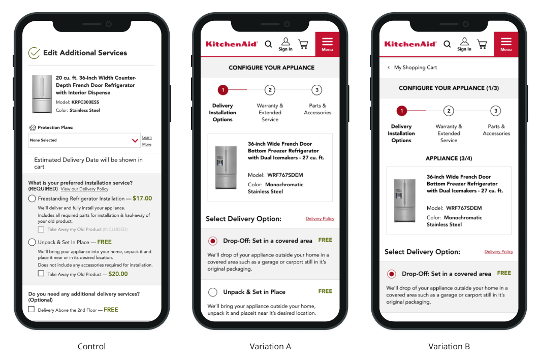 Redesigned Experience – Variations A and B – a full page stepped experience to “configure your appliance” served after “add to cart” in Variation A and after “proceed to checkout” in Variation B.