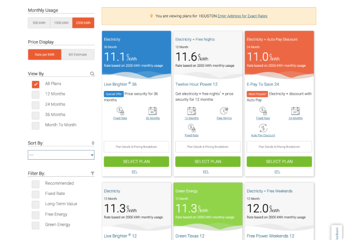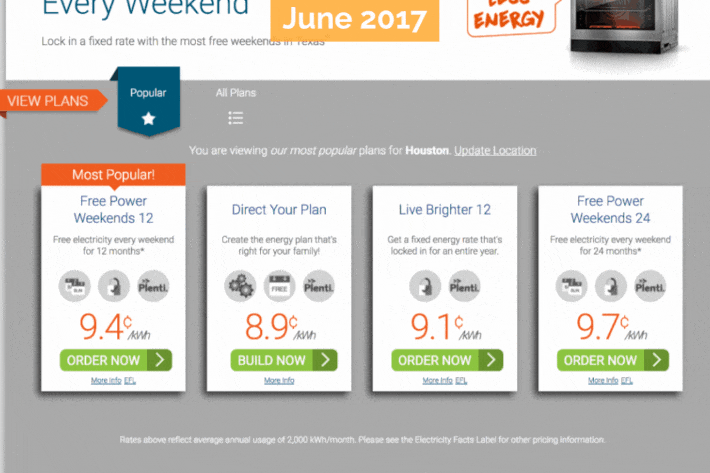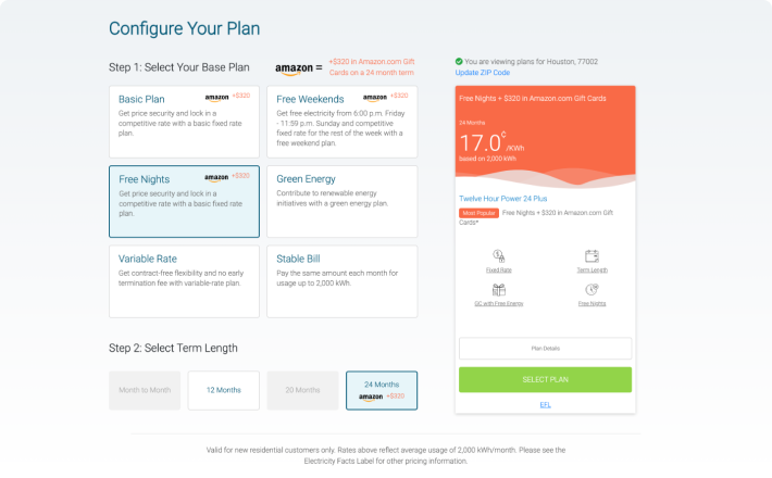 The plans page was a place where users could shop and select an electricity plan for purchase, comparing and contrasting their choices. Similarly, to shopping for a wireless plan, shoppers could visit the plans page and pick a plan that was suitable to their individual needs.