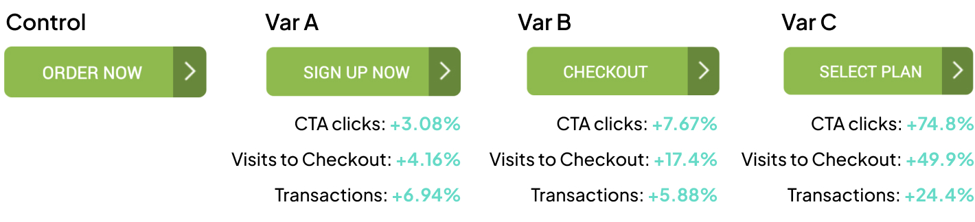 The results clearly and profoundly confirmed our hypothesis; users wanted a less committal, more inviting CTA that helped see them to the next step of their journey. Variation C’s “Select Plan” copy was a clear winner, capitalizing on reduced anxiety and thus friction at the CTA point, ultimately increasing the volume through the funnel to the checkout and increasing transactions. As resounding success evidenced by the above. A CTA copy test can still be hugely impactful if it’s a key part of the customer journey and if its copy is overlooking some key LIFT points (relevance and anxiety in this case).