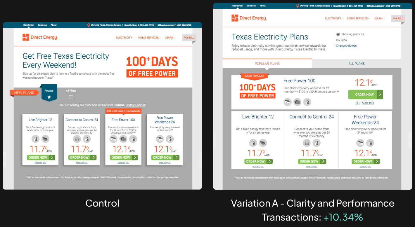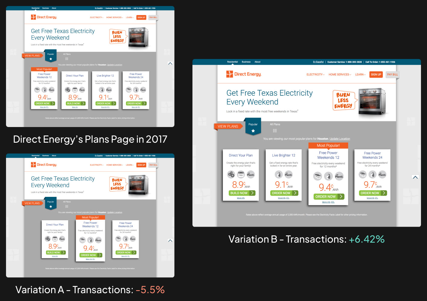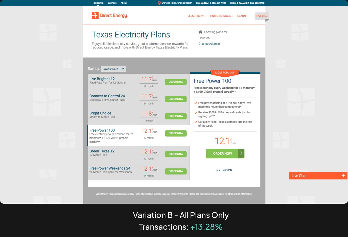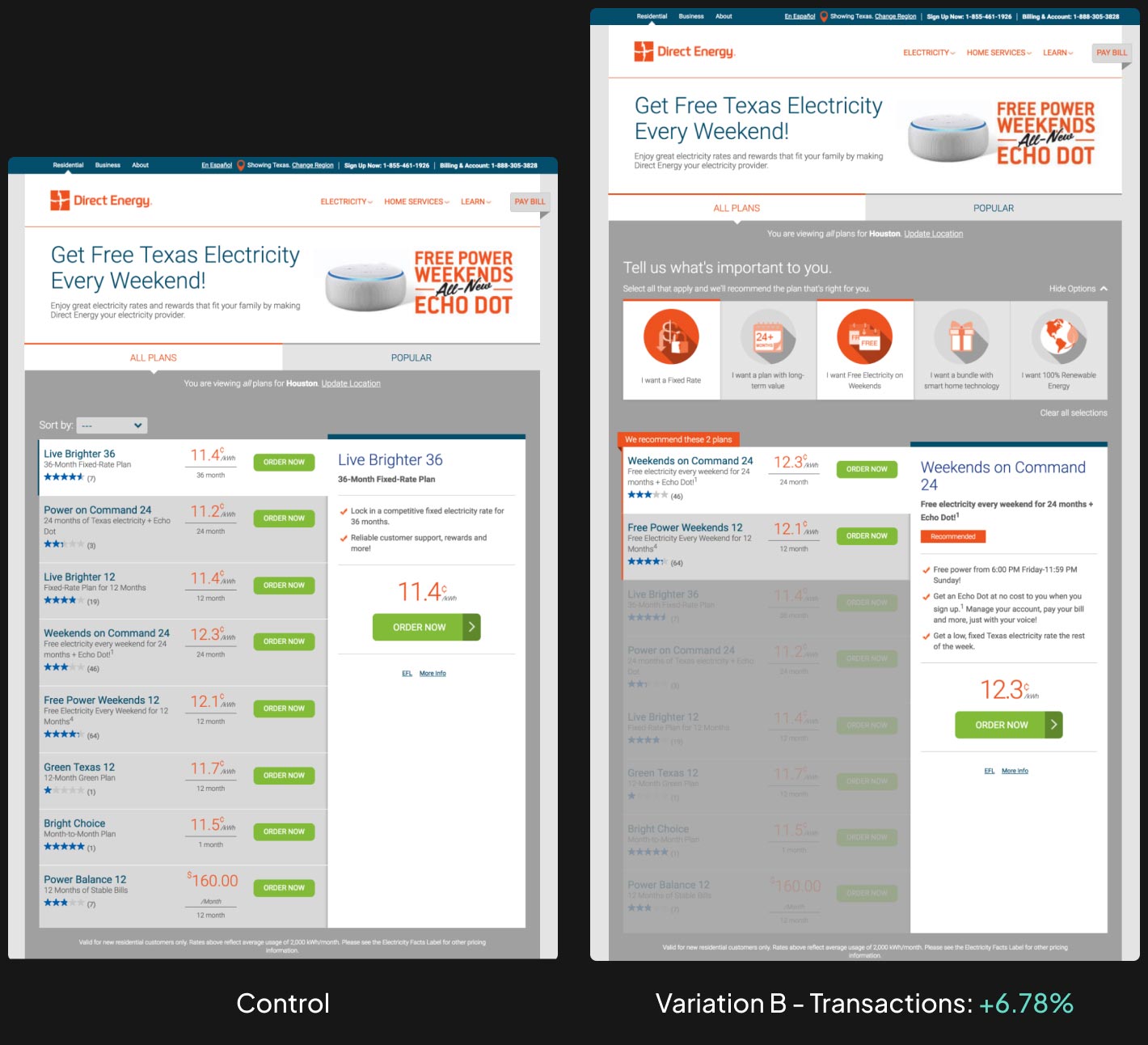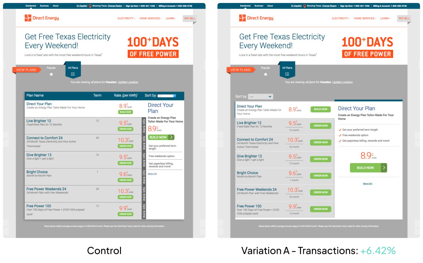 This variation increased transactions by over +13%. Interestingly, removing the promotional copy may have increased clarity for shoppers because they no longer had to determine which plan(s) the promotion was associated with. This experiment helped further validate for Conversion how the power of choice would lead to both a better experience for users and more conversions for Direct Energy.
