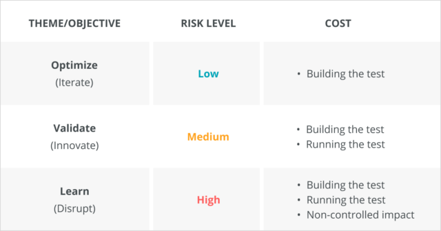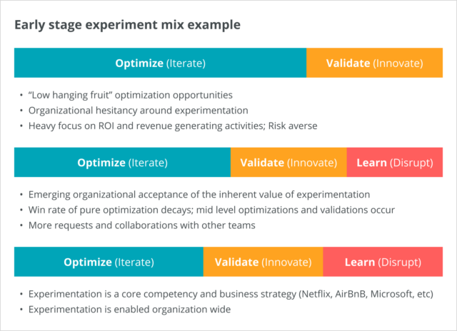 These are larger questions that are focused on answering core business and site experience questions and less focused on simple optimizations to the user experience. These innovations have pushed our experiment mix further into the validation and disruption phases and advanced the maturity of our experimentation program together.
