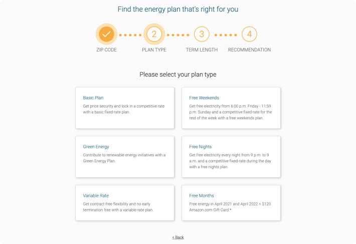 Other “next step” questions we looked at addressing were: “What would a more robust plan recommendation wizard look like and would customers use it?” Would it change the way the plans they buy or the features they select?” Building an energy plan chooser gave us new insight into what effect a recommendation based UI would have on customer acquisition.