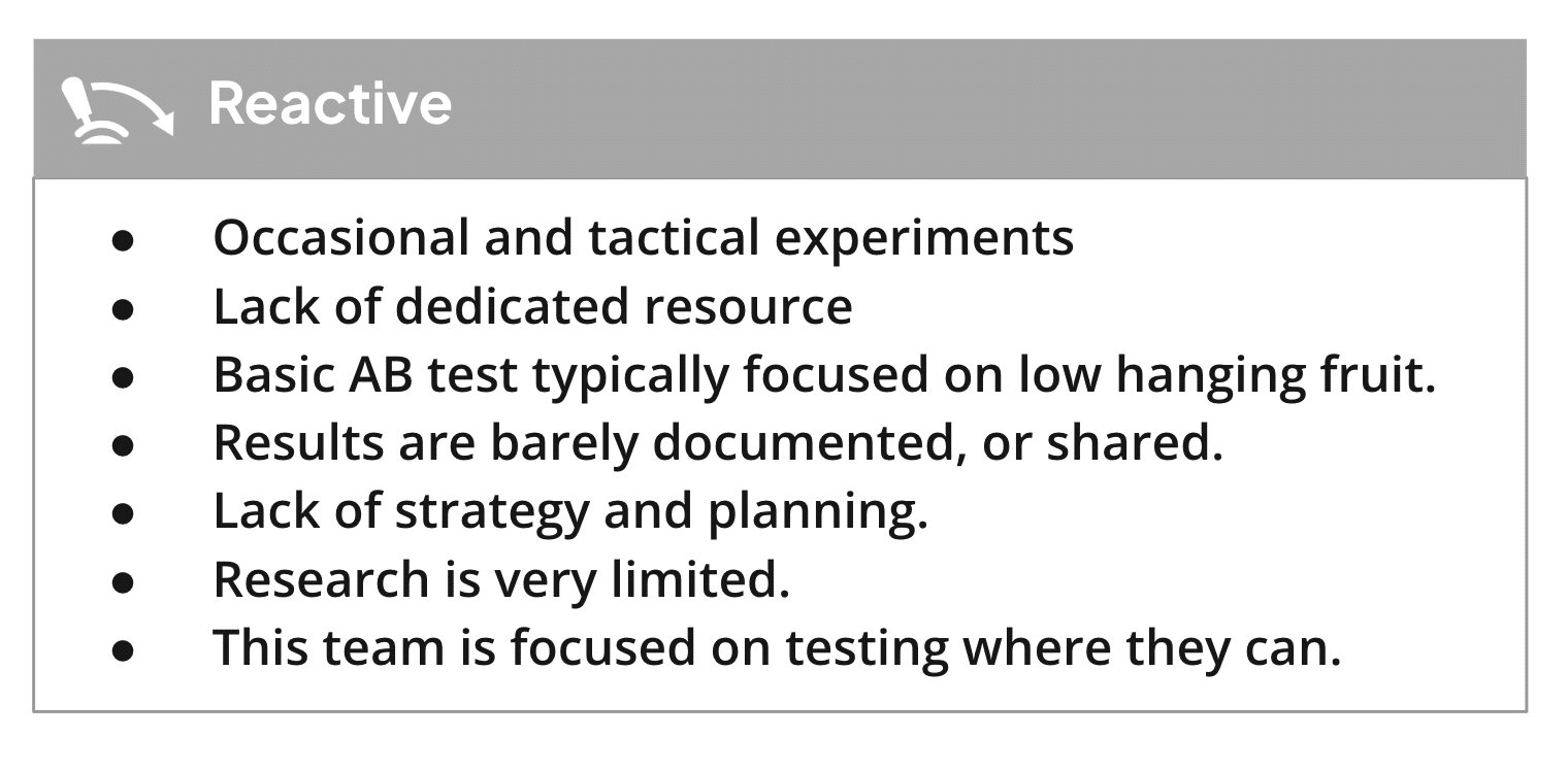 Teams at the reactive stage are characterized by ad hoc, sporadic testing initiated by individuals without strategic direction or leadership support. These organizations typically run occasional experiments focused on low-hanging fruit, with basic A/B tests that lack proper documentation or knowledge sharing.