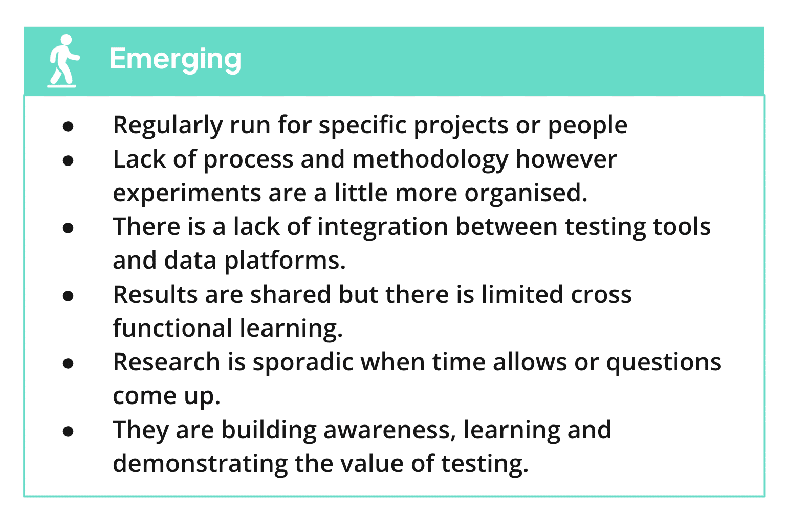 At the emerging stage, experimentation begins to gain traction within specific teams or projects. While there’s still no formal framework or strategy, experiments become more regular and organized. Teams start building awareness of testing’s value and demonstrating wins to gain broader support.