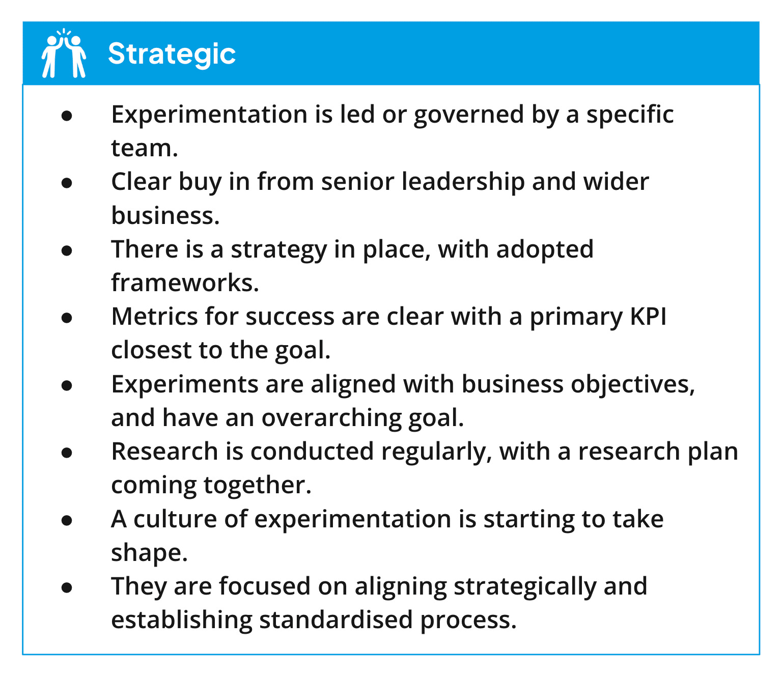 Strategic programs represent a significant maturity leap. Experimentation is now recognized as a strategic activity with clear buy-in from senior leadership. A dedicated team leads or governs experimentation efforts, with established frameworks for hypotheses, experiment plans, and summaries.