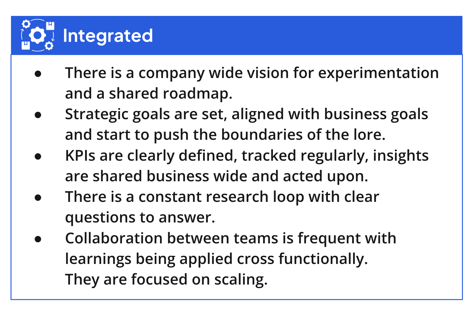 Integrated organizations have experimentation embedded across the entire company. There’s a company-wide vision with a shared roadmap, and most of the business is empowered to experiment. Strategic goals align with business objectives while pushing the boundaries of established norms.