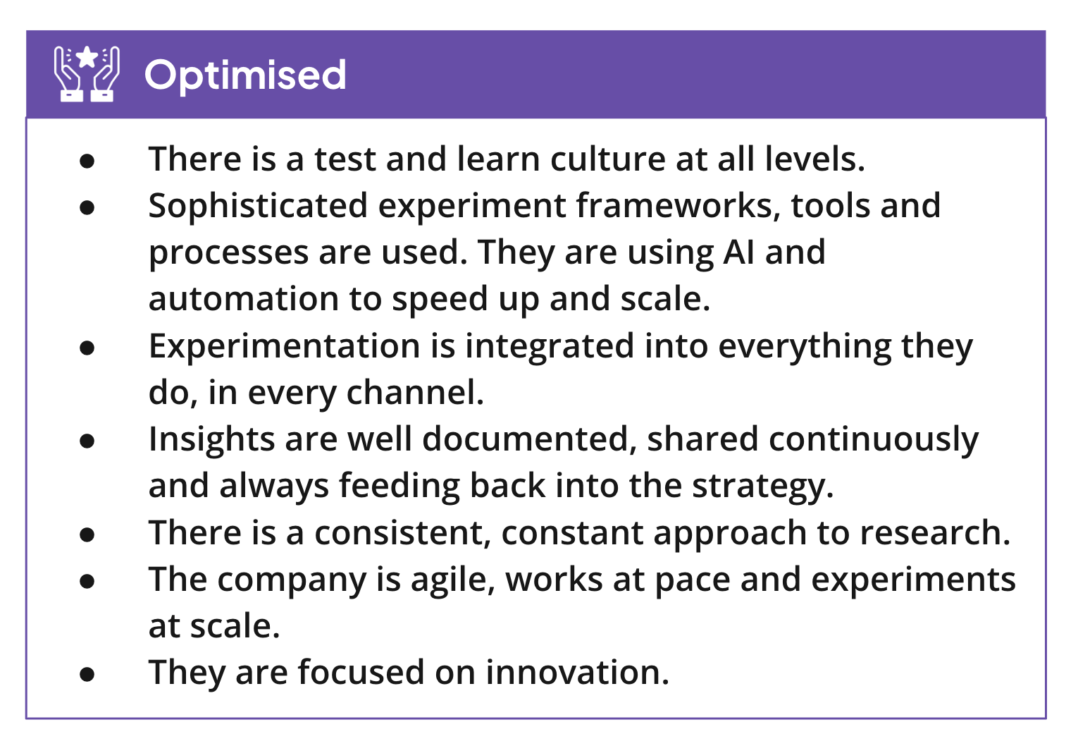 The process is continuously refined, with everyone following and optimizing the delivery process. Insights are well-documented, shared continuously, and feed back into strategy. Research is consistent and constant, bringing in new methodologies. These organizations often outgrow commercial testing tools and build their own, pioneering complex measurement and experimentation approaches. They focus on innovation and competitive advantage through experimentation.