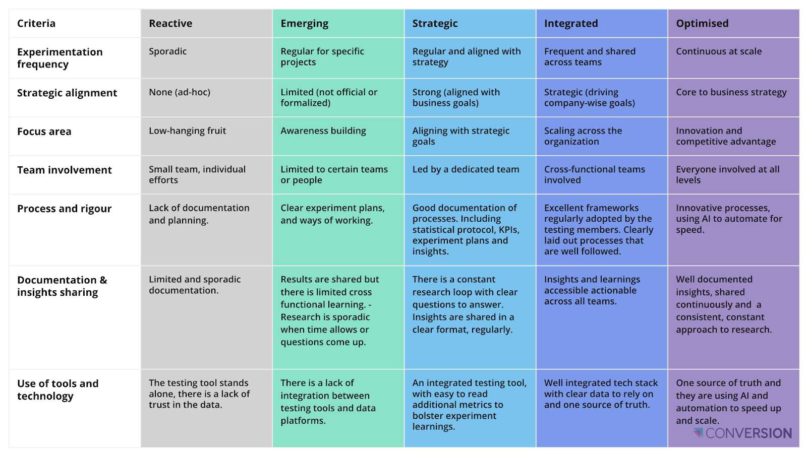 This dimension examines what you’re trying to achieve with experimentation. Are experiments random and goalless (Reactive), or do they ladder up to strategic business objectives (Strategic)? The most mature programs have company-wide goals that push boundaries and treat both learning and earning as valuable outcomes.