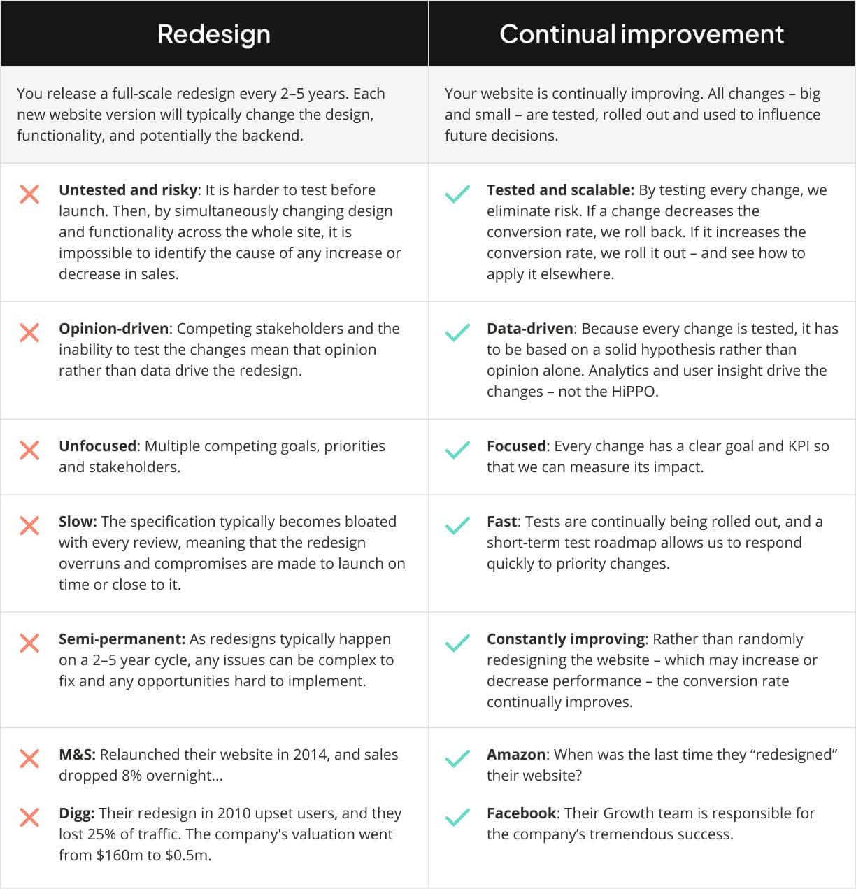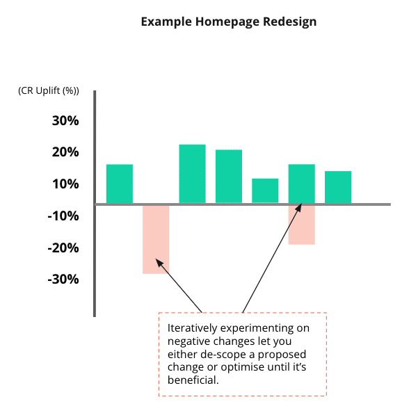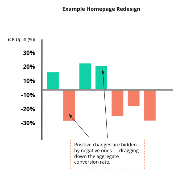 Why is this so important? During a complete redesign, it might appear that the overall conversion rate has decreased. Yet, this dip could be attributed to only a handful of changes having a negative effect. Meanwhile, some changes could be driving positive results, but the negative impact of the majority overshadows them. Since these positive changes remain hidden, it becomes impossible to identify and refine them through iteration.