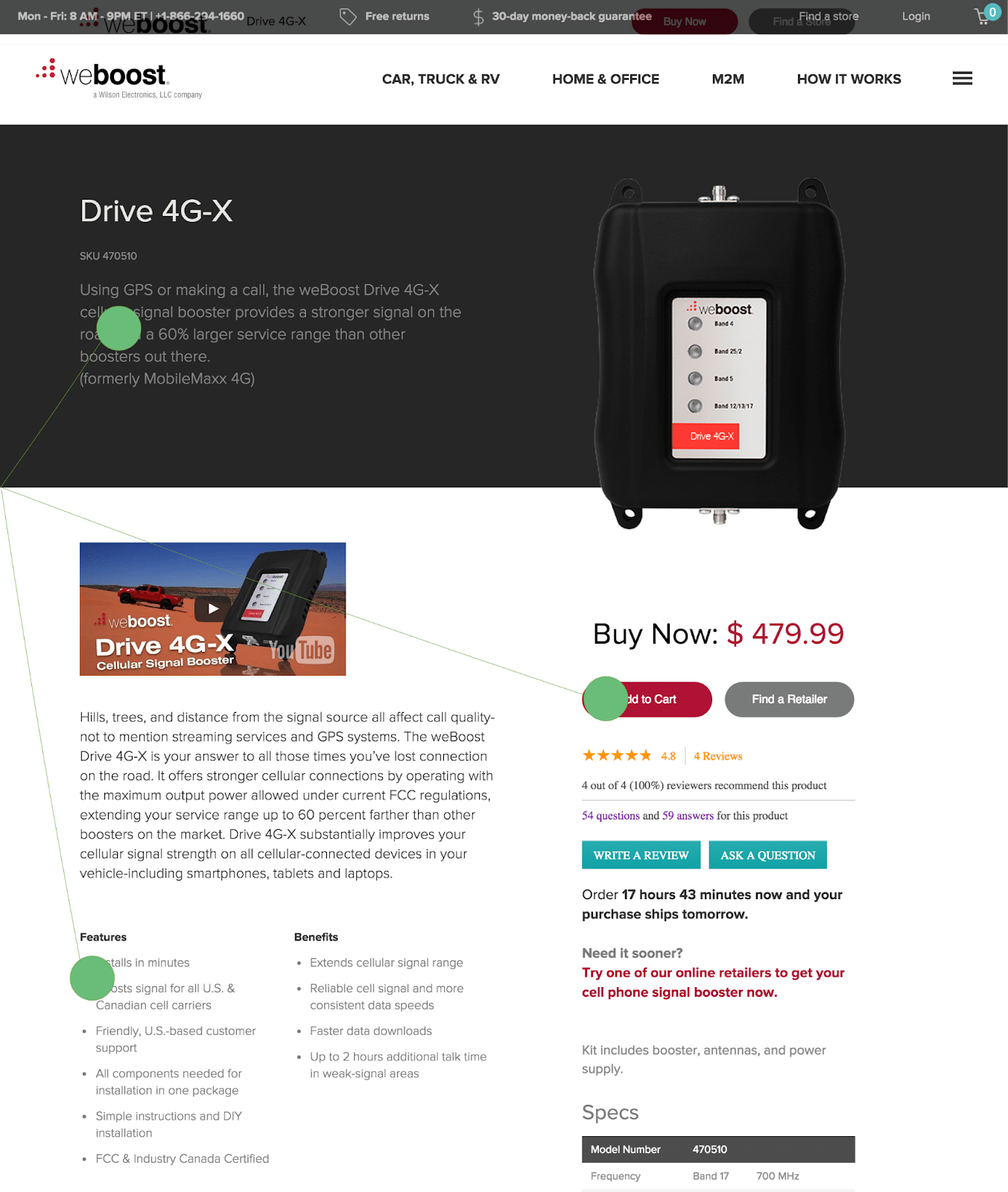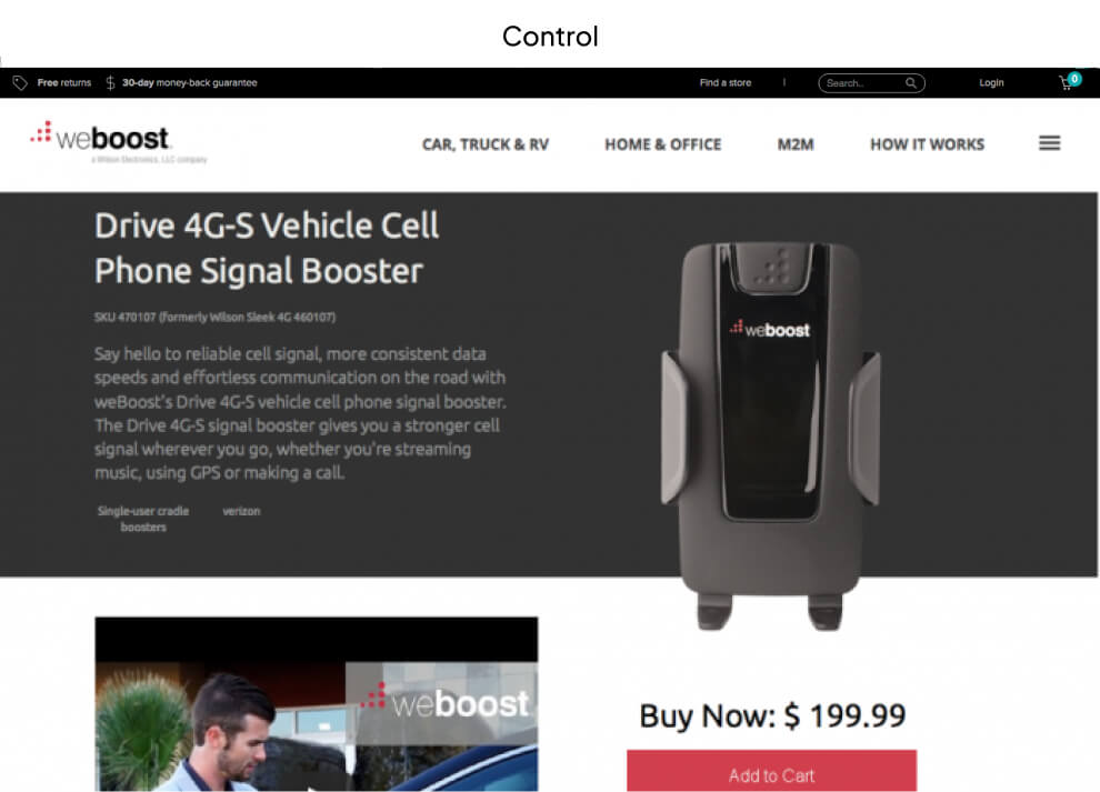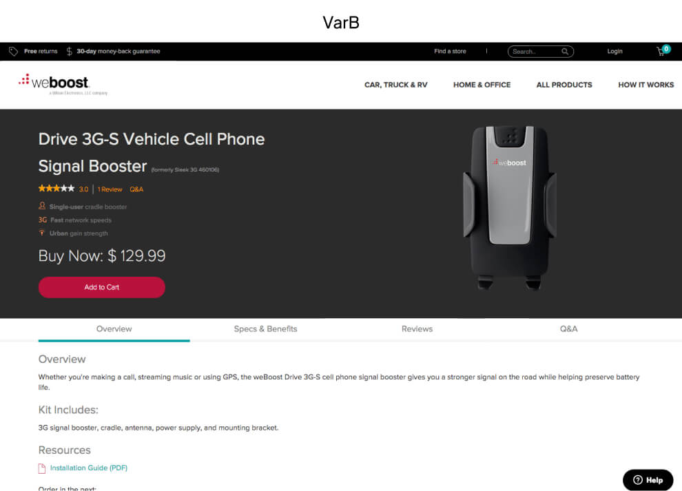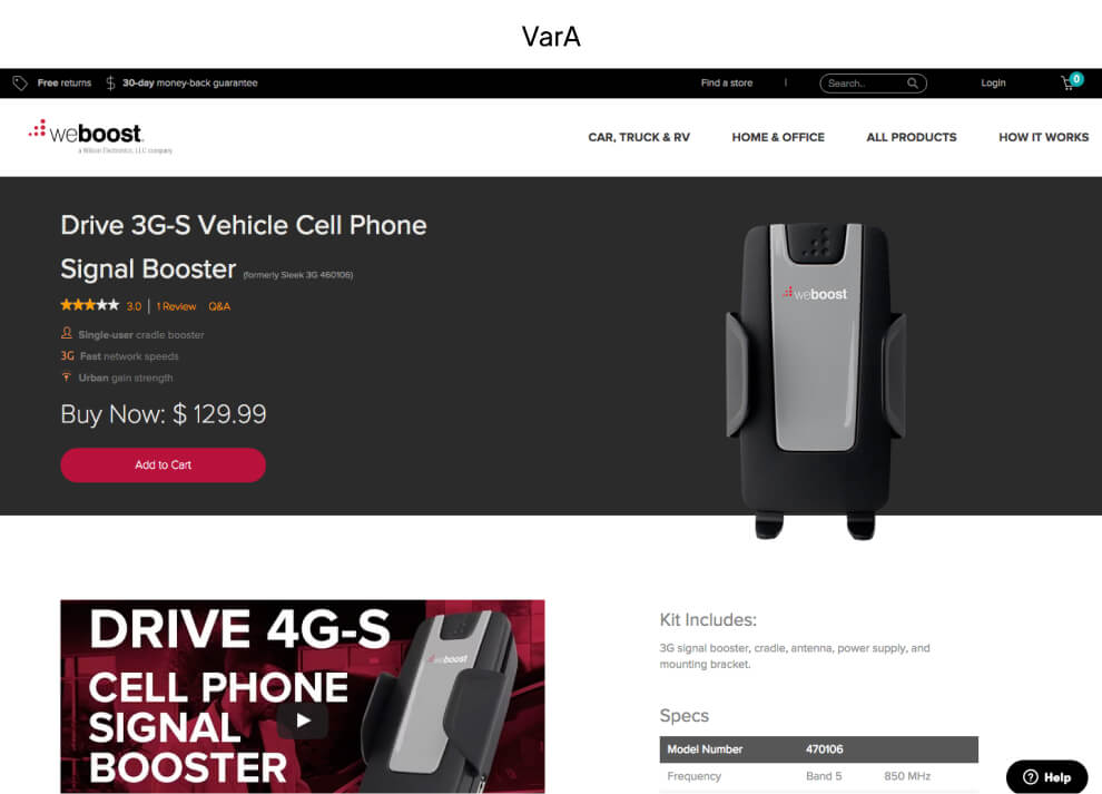 We introduced variation B to address below-the-fold issues. We implemented tabulated information, a strategy that had previously proven effective on the weBoost homepage.