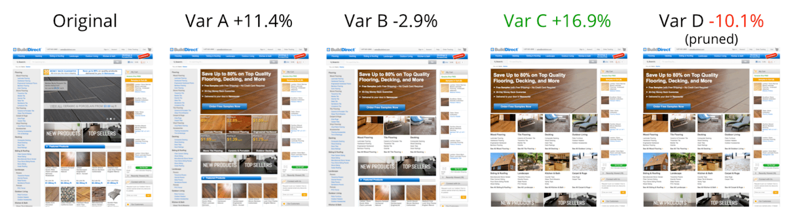 BuildDirect, a leader in high-quality flooring, was looking to redesign its homepage. Instead of approaching this through a traditional redesign and implementing several changes simultaneously, we did this iteratively by testing various new components separately in an A/B/n test.