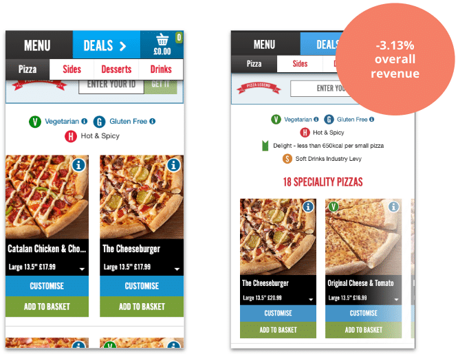 Based on some user research, the Dominos team was keen to switch from a vertical scroll to a horizontal scroll on its menu. We urged them to test. They did. This change ended up being detrimental to the site, losing 3.13% of overall revenue, which, given the company’s size, would have equated to a loss of over $100 million.